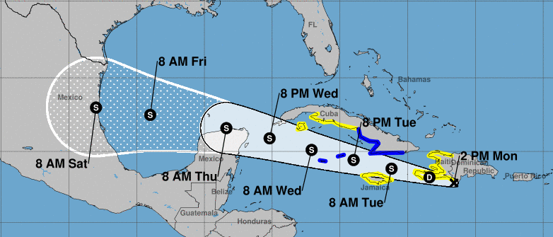 República Dominicana.- Para esta tarde se espera que continúen las precipitaciones asociadas a los campos nuboso de la depresión tropical GRACE en las regiones, sureste, noreste, norte, suroeste, cordillera Central y zona fronteriza donde se podrían generar acumulados entre 100 mm a 250 mm pudiendo ser superiores en puntos aislados, prevemos que las lluvias se extenderán incluso entrada la noche. A la 1:00 P.M, la depresión tropical GRACE fue ubicada cerca de la latitud 17.7 norte y longitud 71.8 oeste, esto es a unos 35 km al sur/suroeste de Pedernales, y a unos 105 km Puerto Príncipe, se mueve hacia el oeste a unos 24 kph y vientos máximos sostenidos de 55 kph, con ráfagas superiores. Presión mínima central 1007 milibares.