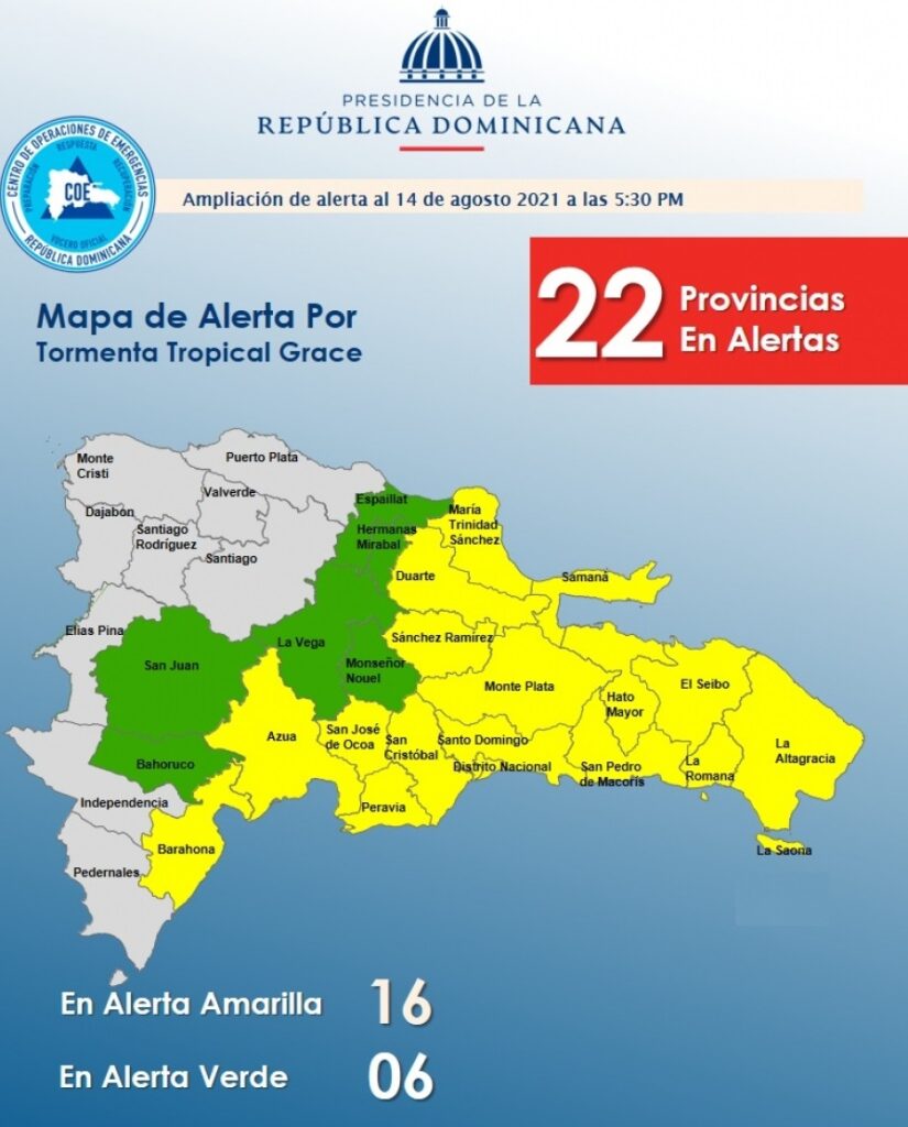 República Dominicana.- La oficina Nacional de Meteorología informó que la actividad de nubosidad y lluvias asociadas a Grace están afectando en estos momentos la parte sur de las Antillas Menores. A las 4:00 p.m. de hoy la tormenta tropical GRACE se ubicó cerca de la latitud 16.3 norte y longitud 59.2 oeste, esto es a unos 220 km al este de Guadalupe, Islas de Sotavento y a unos 990 km al este/sureste de Cabo Engaño (La Altagracia), moviéndose rápidamente al oeste a unos 37 kph y vientos máximos sostenidos de 75 kph, con ráfagas superiores. Los vientos con intensidad de tormenta tropical se extienden a unos 55 km fuera de su centro.
